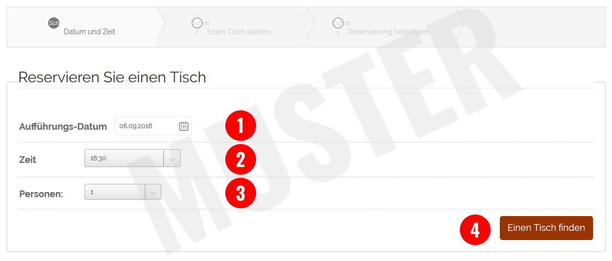 1. Klicken Sie bitte in das Feld mit dem Datum der Aufführung, zu dem Sie uns besuchen und Ihren Tisch reservieren möchten. Es öffnet sich ein Kalender. Wählen Sie dort das Datum Ihrer Aufführung aus.